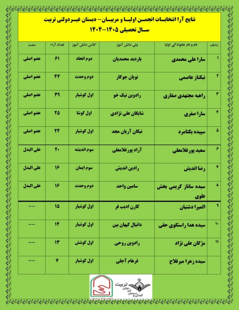نتایج انتخابات انجمن اولیا و مربیان 1405 - 1404